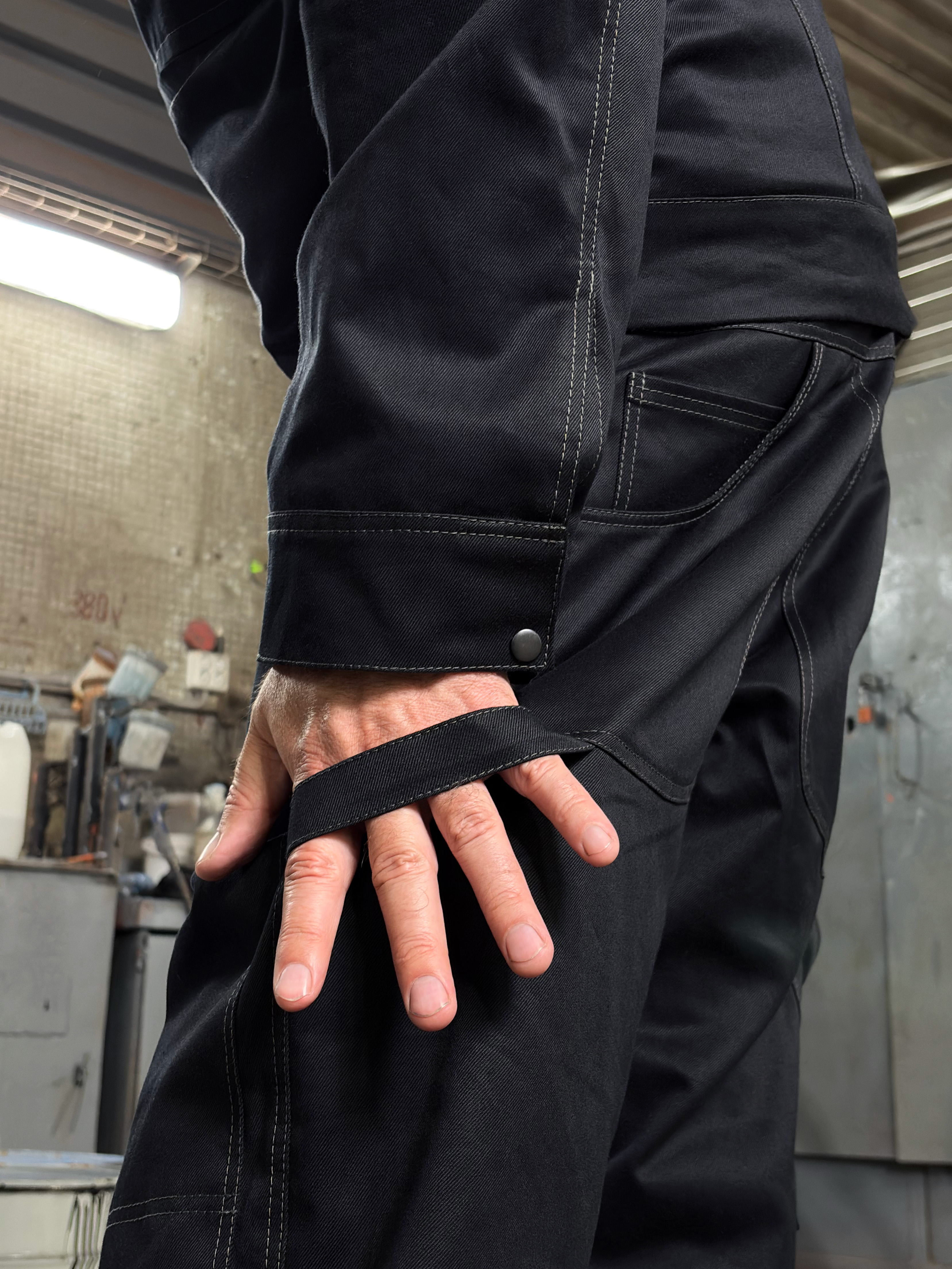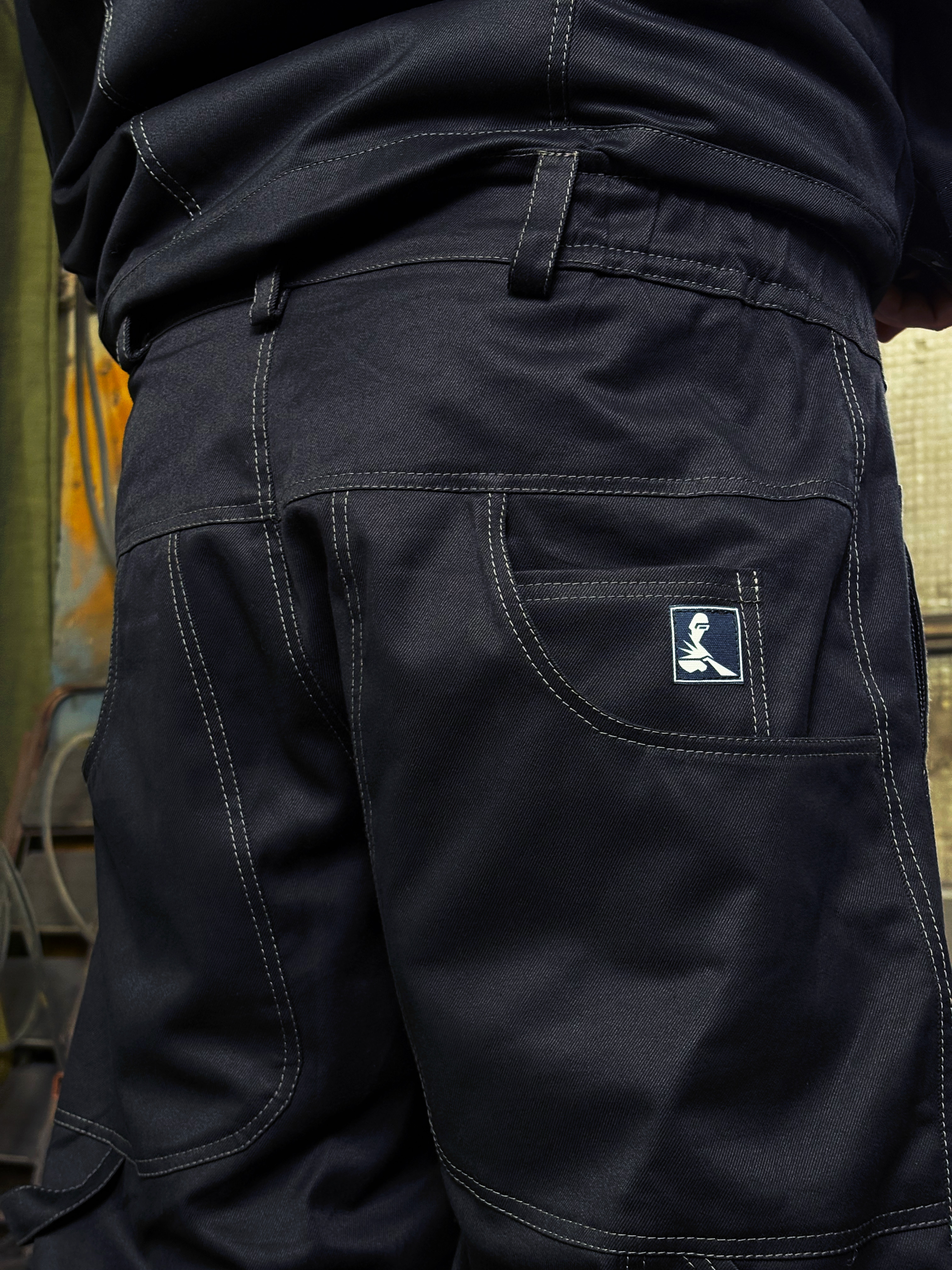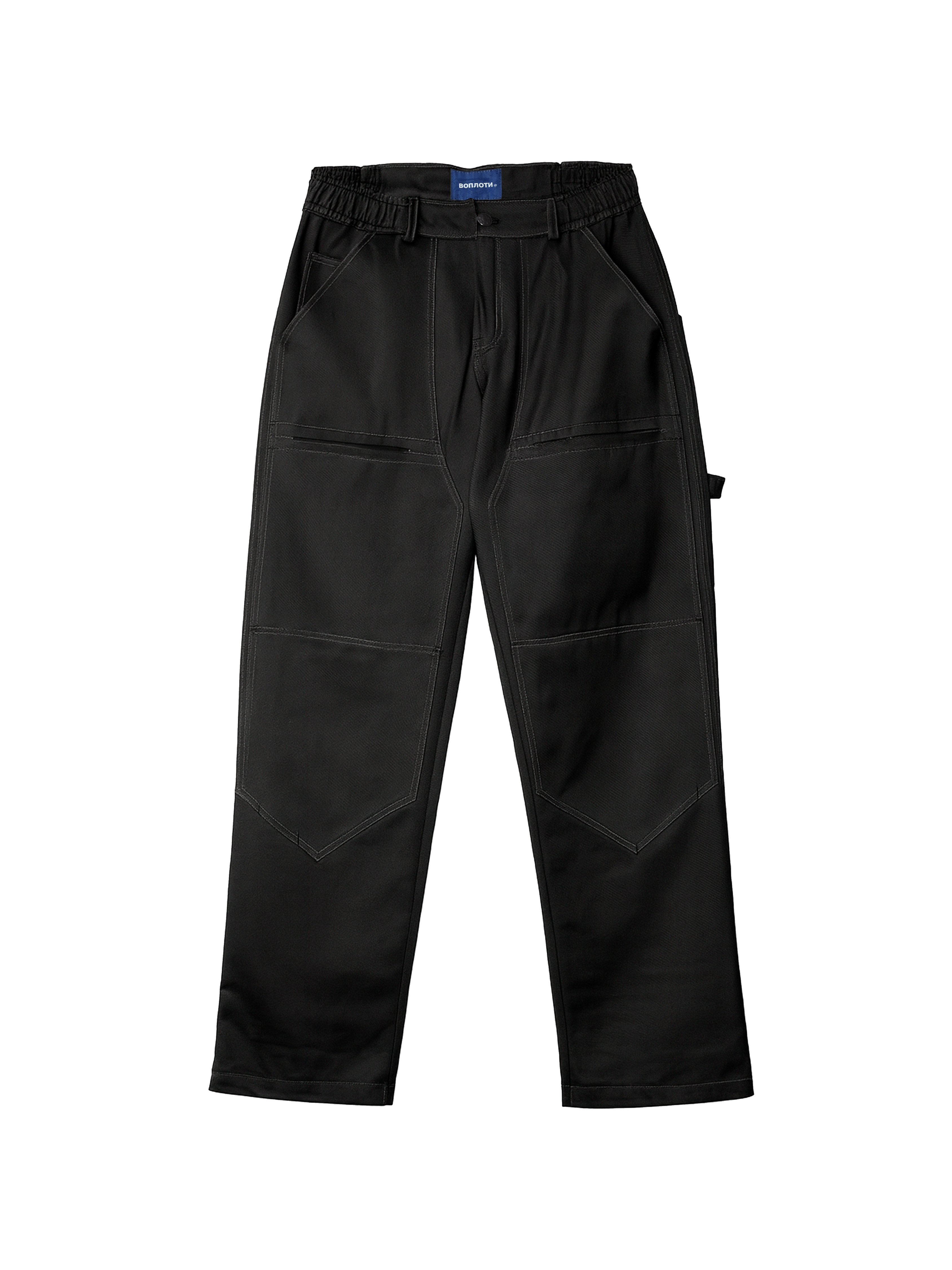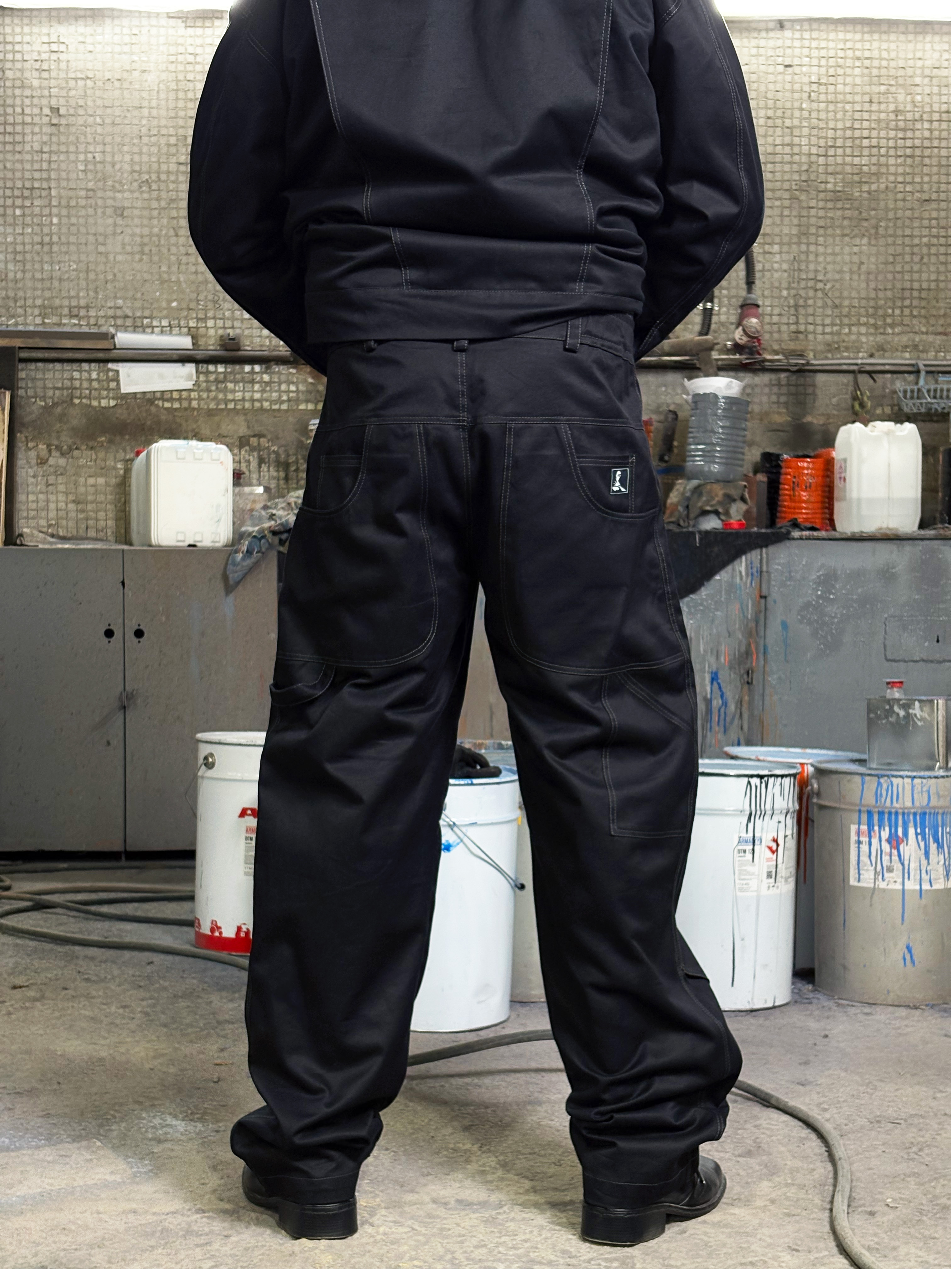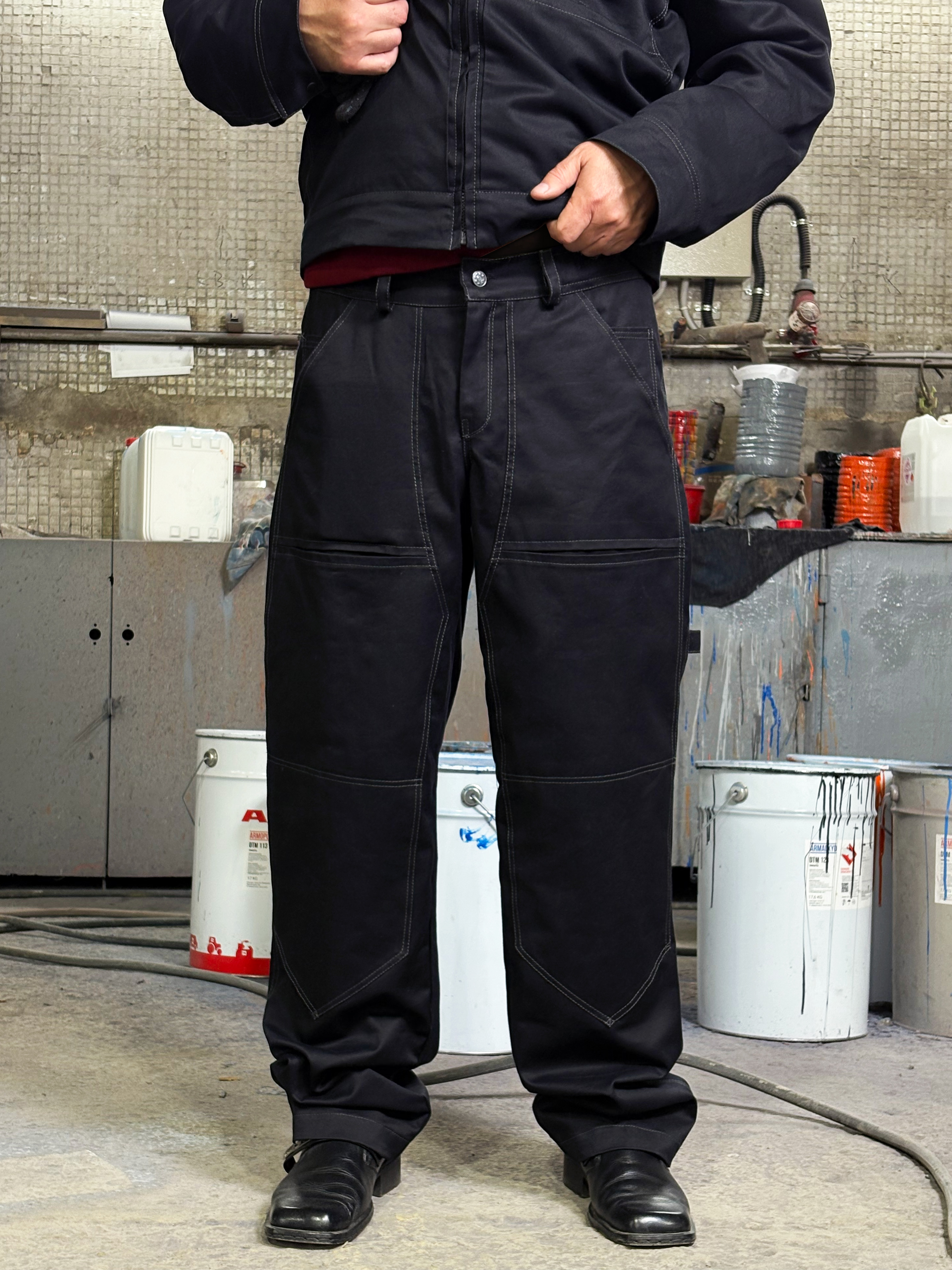 Передняя часть усилена дополнительным слоем ткани, предусмотрена система функциональных карманов: боковые, задние и надколенные — с возможностью разместить мягкие вставки для работы на коленях. Дополнены шлёвкой для инструмента.